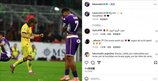 莫德里奇晒出了自己的赛场照,配文写道:“伟大的胜利!Forza Milan。”